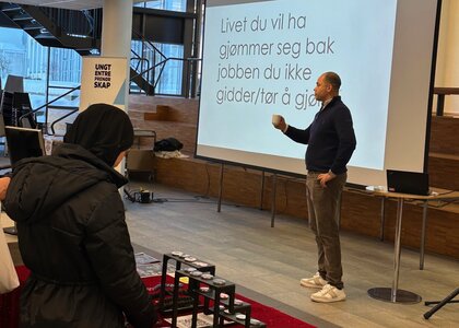 Før ungdomsbedriftene fikk vist seg frem, var det et foredrag med Aiman Shaqura. Han er siviløkonom og gründer som brenner for inkludering, mangfold og innovasjon.